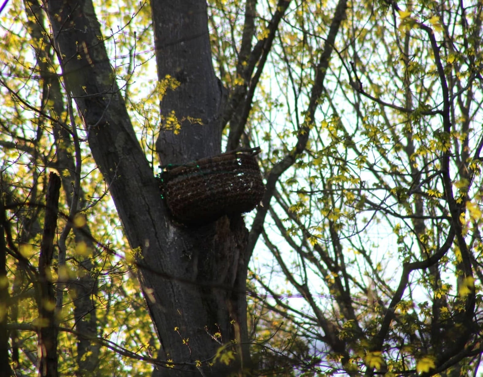 - The nest is now an extremely man-made nest-basket contraption, and I make an involuntary little bleat of distress when I see it in my binos. A photographer tells me that earlier this week the nest partially collapsed and the owlets fell out and hit the ground. Raptor Rescue came out, and they made it through and are back where they belong, but now there's this rig that only the mother owl can enter, and it looks depressing. The mom is out there somewhere, in nearby tree, but way out in the distance and in deep cover, apparently. The photogs have a bead on her, but I never even saw her.