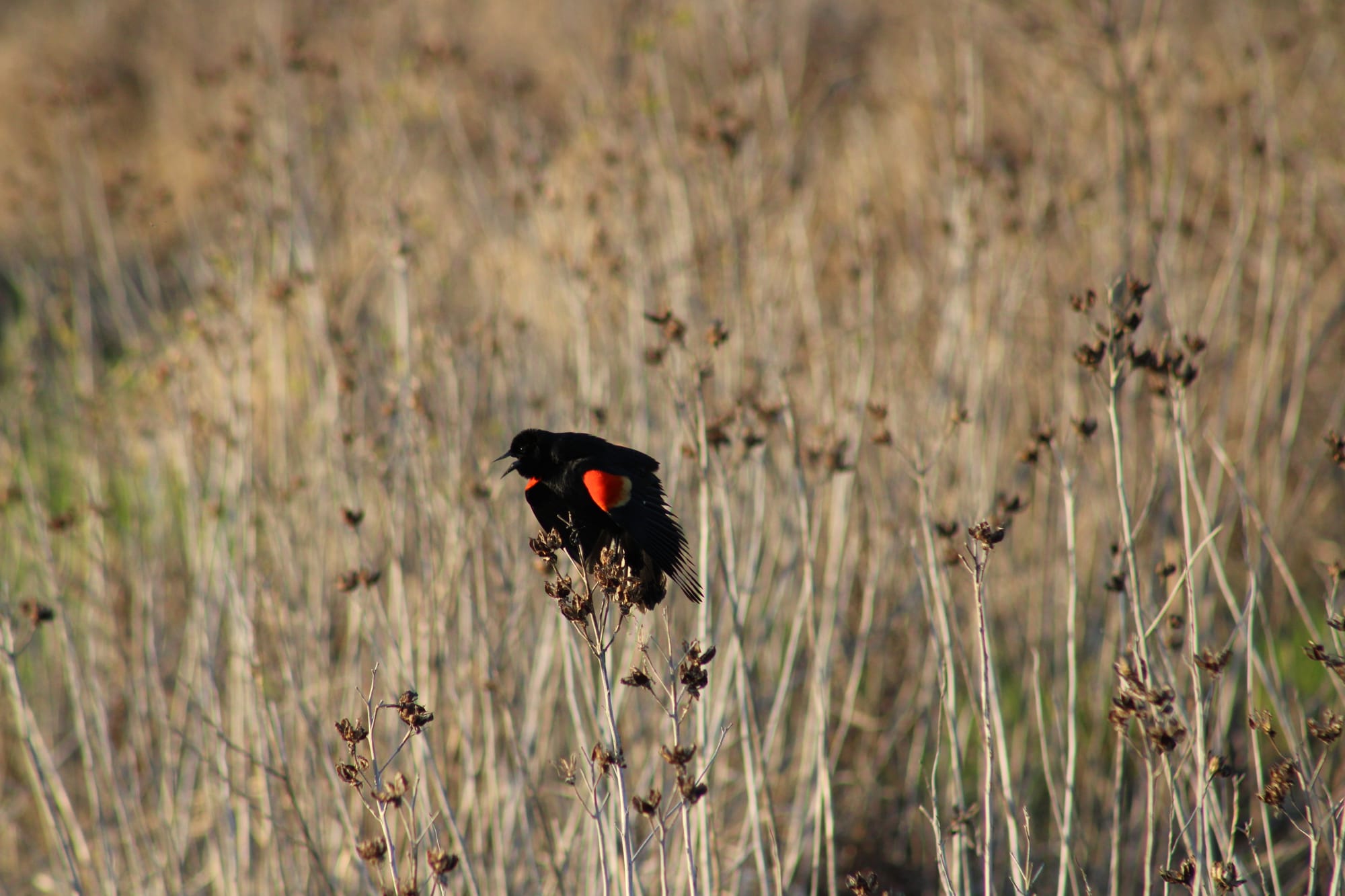 - At least now the blackbirds are out. This time of year, the males are still jockeying for personal space, and at sunset they spread all across the park as they get ready to call it a day. They settle on the tip top of marsh plants and stake out a claim, a few hundred feet apart, and just screech BLAAAAACKBird, then fly a few yards further on and do it again, until they're ready to settle down for the night. Their epaulets flare out when they call, little splashes all over the brown. It's genuinely a great time, watching them.