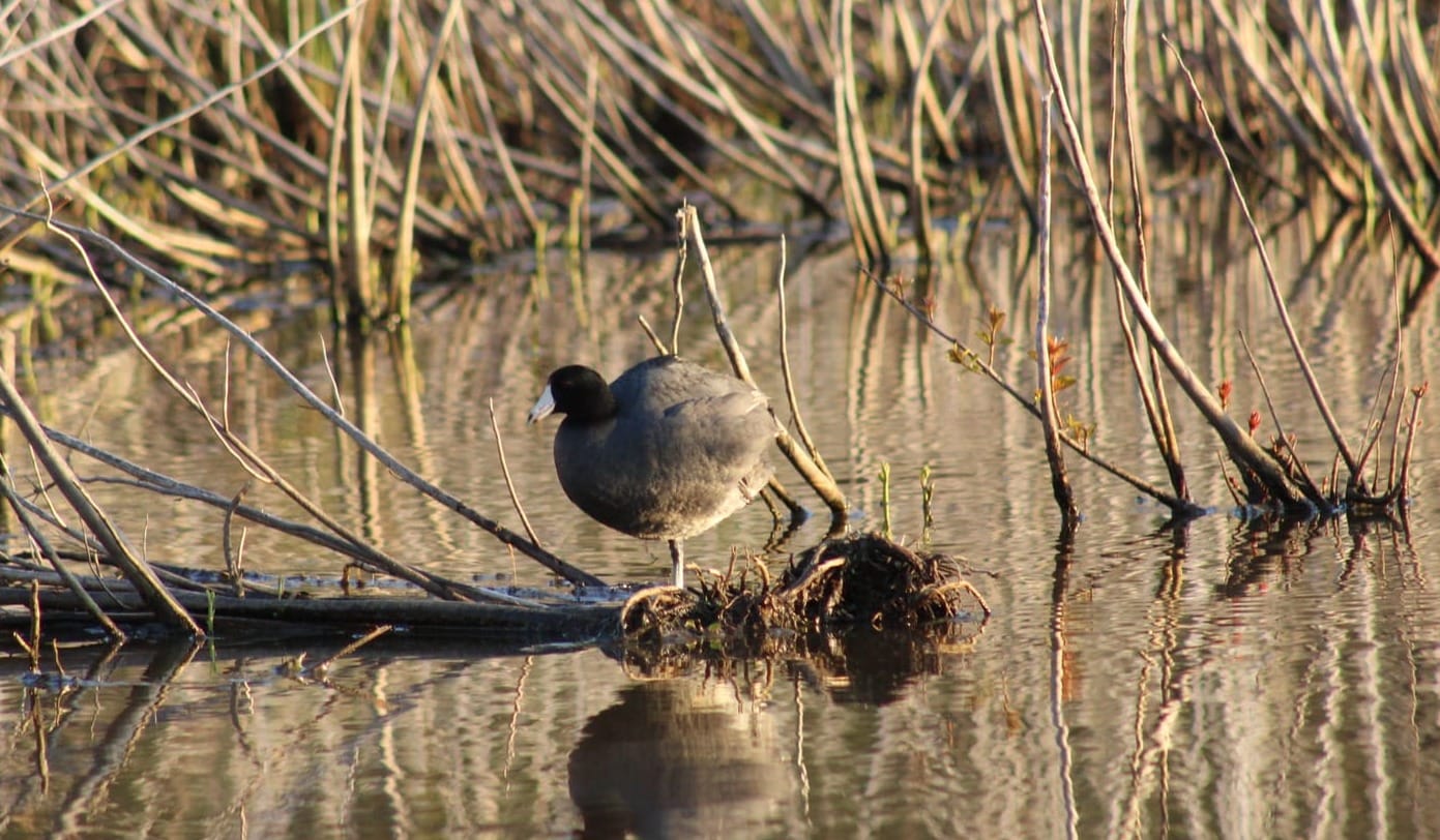Bird Species: northern cardinal, European starling, American robin, Canada goose, mallard, the hybrid celebrity duck, American coot, red-wing blackbird