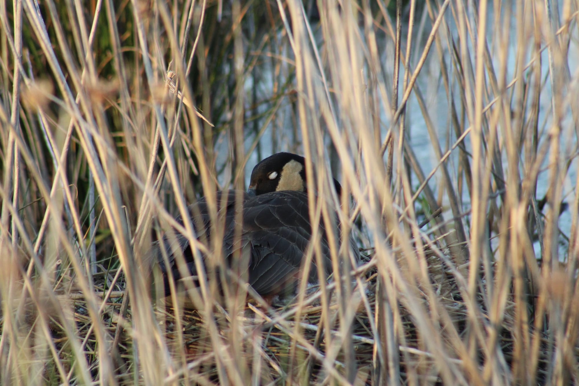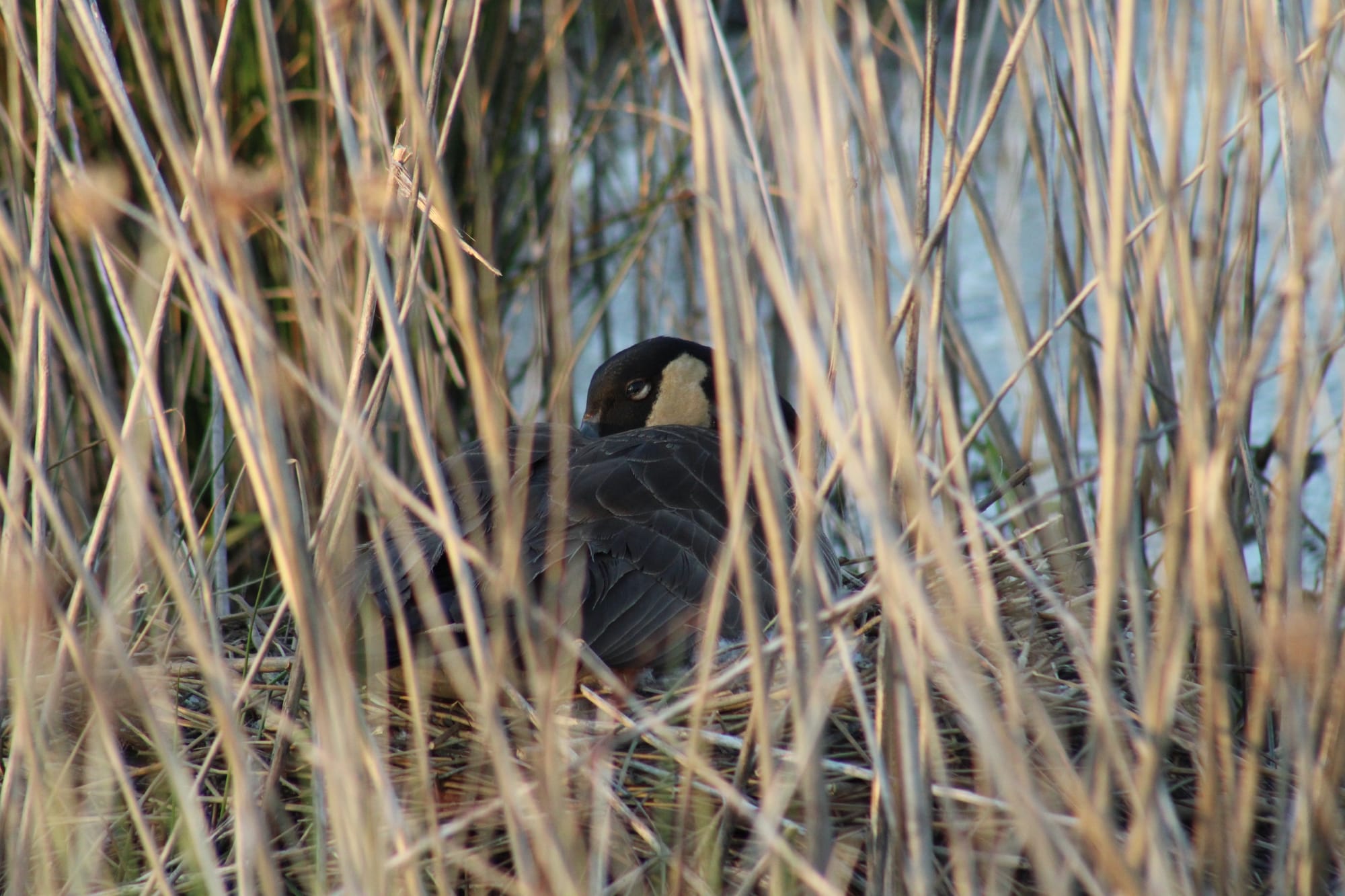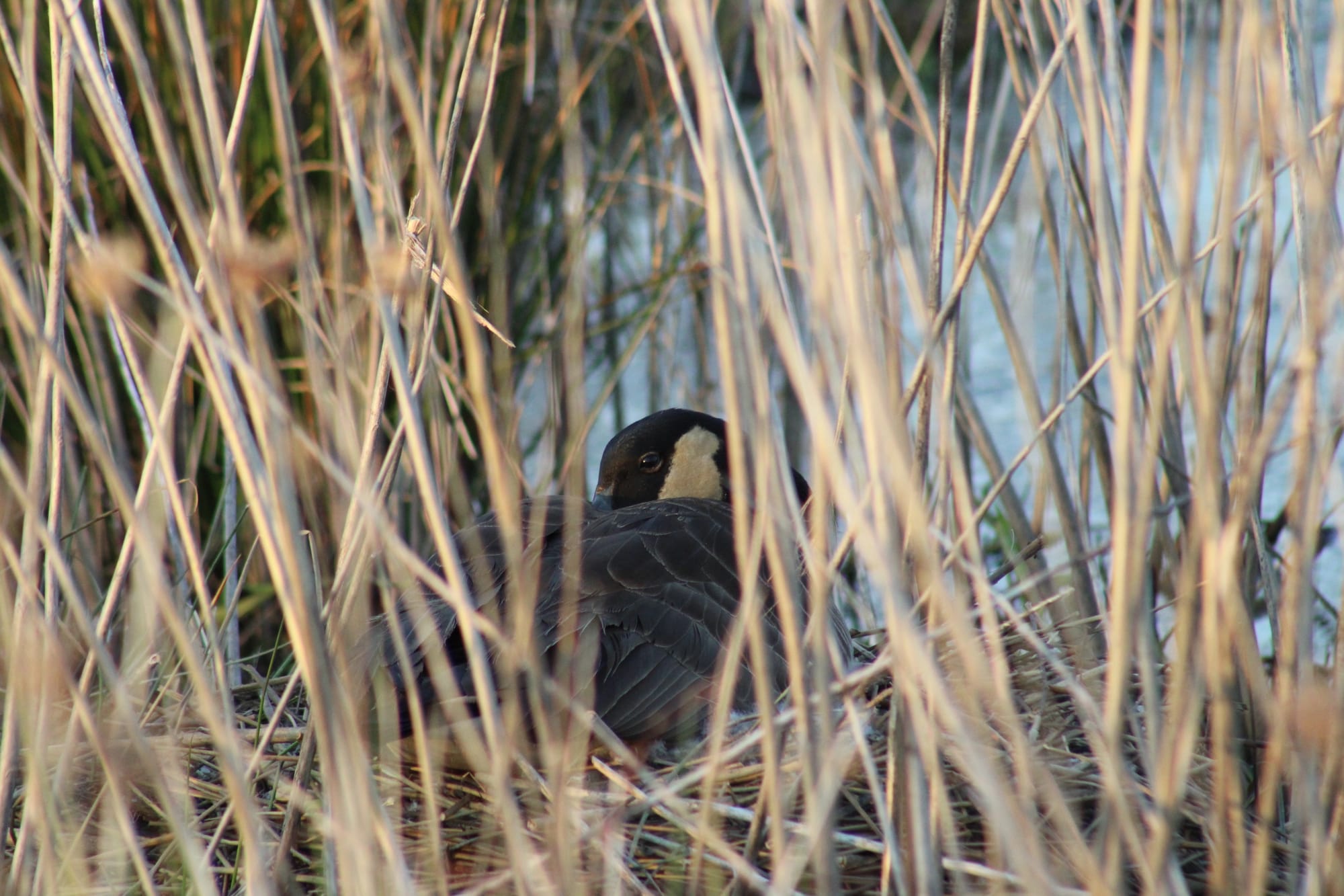 Canada geese have a nictitating membrane, but I did not know that until tonight! I had her all framed up, she looked very warm and soft in the golden light of the setting sun, and then her eye just went white in the frame, and I said, "what the FUCK," and then it was brown again, and then white again. I'm sure some people would find this unpleasant, but I loved it. I could have watched her clean her nest and blink all evening. I watched this goose for a very long time and when she was settled, with her head tucked in, I left.