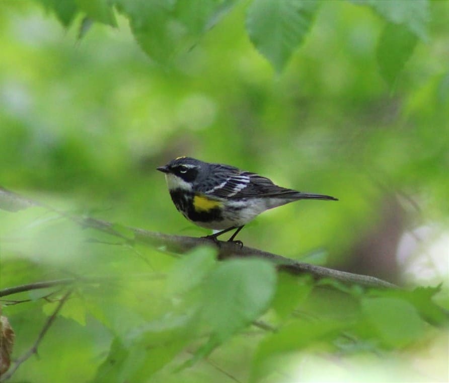 - Oh, warblers! I'm glad I stayed up here around this woodsy little park area instead of going back down the trail again. This is good. And there are a couple of benches tucked in under the trees, so maybe I'll just sit in there and let them come to me.