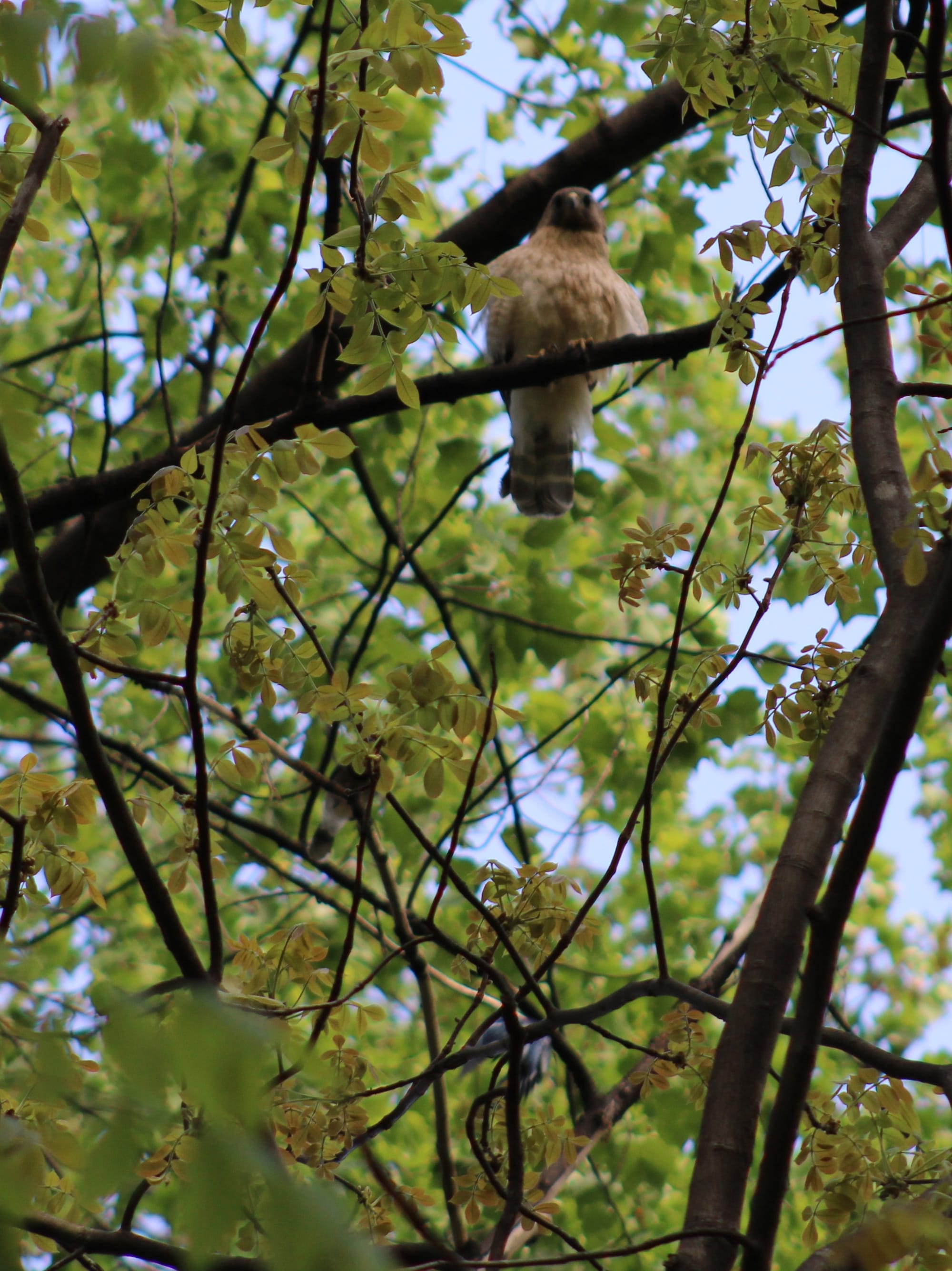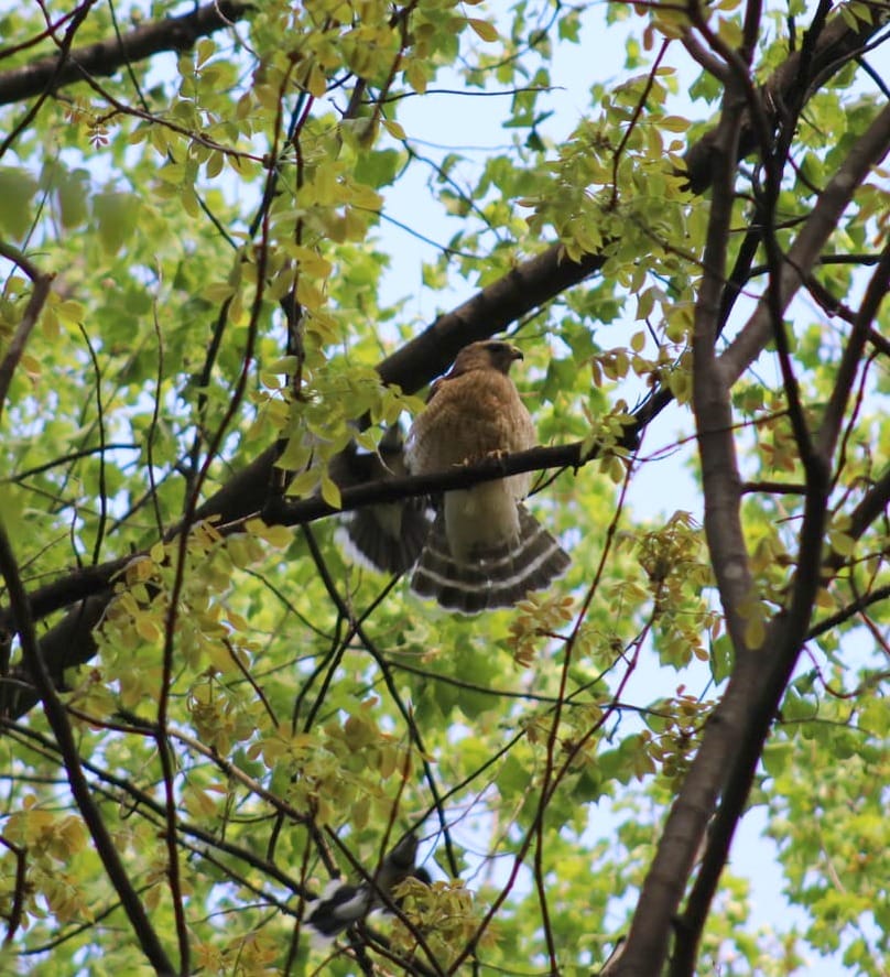 Not big trees, not very high up, just the nearest tree. So now they are all calling like that, a high-pitched, staccato EEET EEET like I've never heard from them before, and very loud, and then almost simultaneously and almost directly overhead, perched up in the canopy, a red-shouldered hawk starts screaming too.
