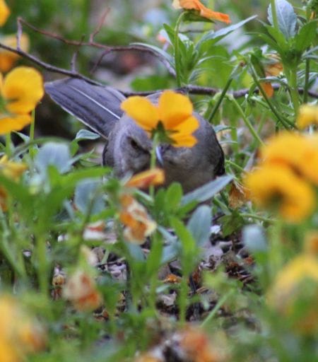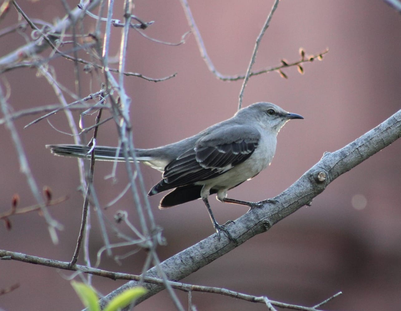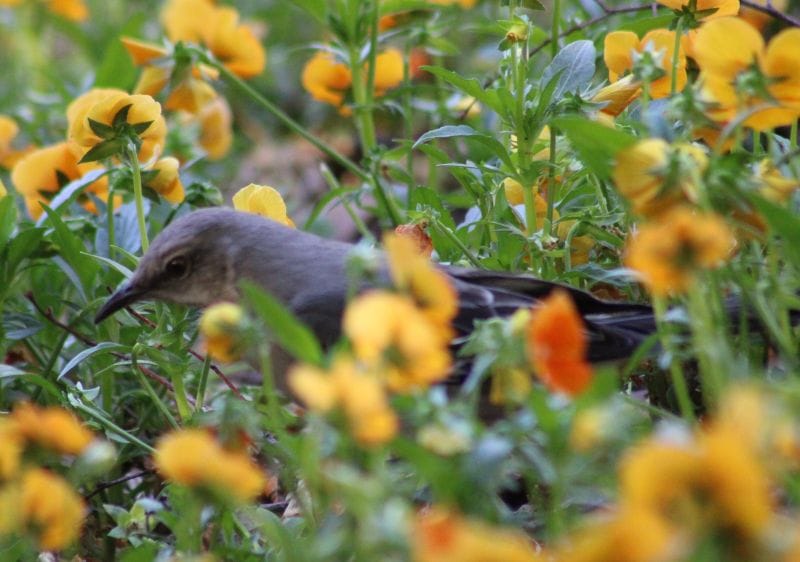 BOTD: northern mockingbird. I thought for a while it would be the grackle, and I was delighted to show it off, but there were a couple of mockers hanging around tonight, and they were terrorizing the whole garden. Here, there, everywhere; they were fighting with starlings on the ground, they were running robins out of trees, that one was positively Godzilla-ing his way through a freshly planted flower bed.