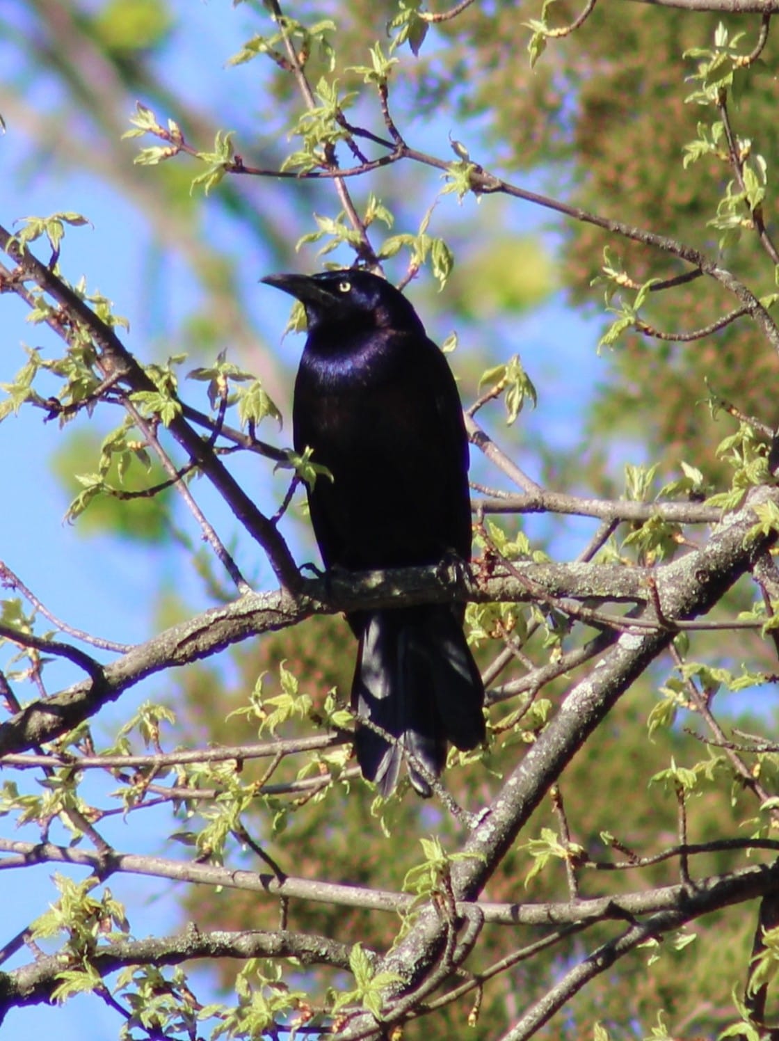 - There is an abundance of huge black birds flying around all over the place today, fish crows and American crows and grackles, and I love them to pieces, even though only the grackle takes a nice photo. It's especially great to see them all on such a blue and green sunny morning. They remind me of a kid's edition of Poe stories I treasured as a child, that had an amazing drawing of the guy showing up to the ball in The Masque of the Red Death. Macabre and spooky and disruptive to the party atmosphere, in a delicious way.