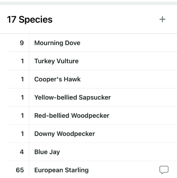 Bird Species: mourning dove, blue jay, American robin, European starling, house sparrow, turkey vulture (flyover), yellow-bellied sapsucker, red-bellied woodpecker, Northern mockingbird, Cooper's hawk, cedar waxwing, song sparrow, white throated sparrow, house finch, dark-eyed junco, house finch, downy woodpecker