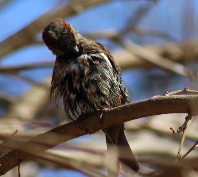 - I don’t think I have ever seen water in the ravine between our property and the neighboring condos, but I guess between the rain and the snowmelt it’s deep enough now for a bird bath. There are sparrows flying down and coming back up soaking wet, drying on a branch for a bit, and going back down. It’s like a loop, many of them are participating. I don’t think it had occurred to me before that of course, they won’t have been able to bathe in the freeze.