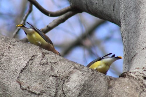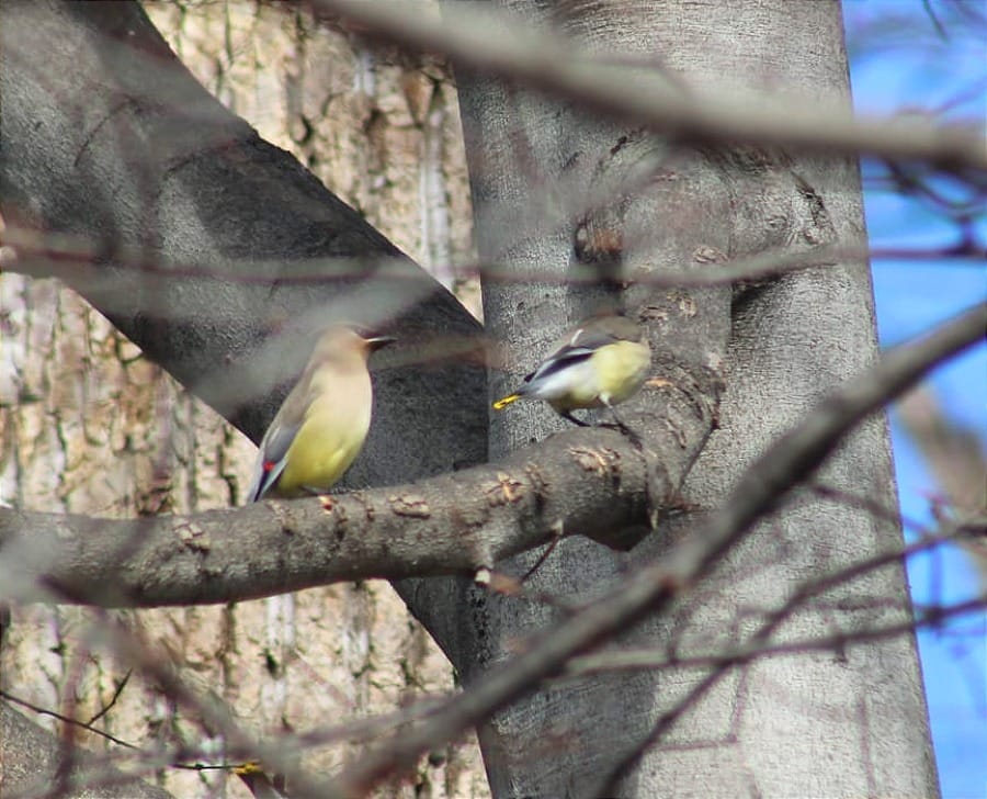 - Well, I will be damned. I had tagged Cedar waxwings as special guest stars earlier in the month, but I got 5 in the neighborhood for the Bird Count, and here are three by the playground! I got a decent shot where you can see the shiny spot of sealing-wax red on the wing that gives them their name.