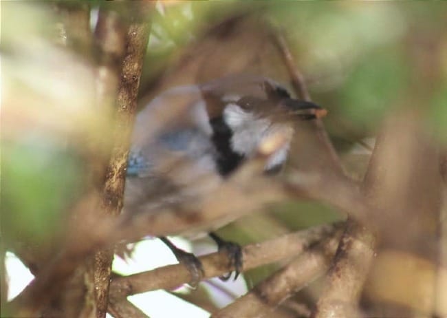 - A blue jay has dived into a large round bush and is in there screaming and snacking, and basically presenting the worst possible photo opportunity. He’s so close, I could stick my hand in this bush and touch him, probably, but there is simply no way to frame him up. I have just been circling this bush in what is now a steady light rain, with my umbrella handle stuck down the front of my bra so I can use both hands to try to find this little bastard. It’s very undignified. I’m better than this.