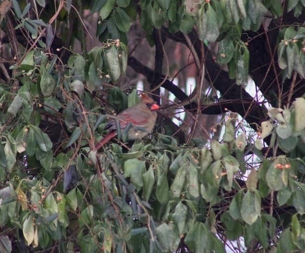 - And there’s Mrs. Cardinal! Who flew directly into a bush as soon as I saw her and is now too far away to focus, but I’ll probably post a pic anyway.