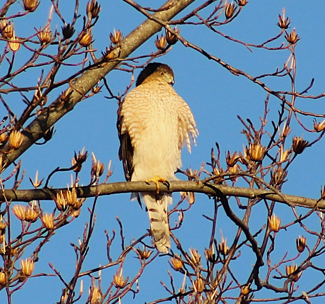 BOTD: Cooper's hawk. I've seen them a bunch lately, and now consider them a neighborhood regular, but this is the first morning I've seen him in a tree on our property. I think on a warmer day you would note that he is much leaner than this. I have seen one circling over the high school two mornings lately. Maybe there are field mice on the football field.