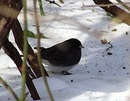 - I don’t know how to explain what I mean, but dark-eyed juncos always look like they are in disguise. I think it’s the pink beak; it looks wildly out of place in all the dark head feathers. It looks like they’ve pulled a cap down low and put on a Groucho nose.