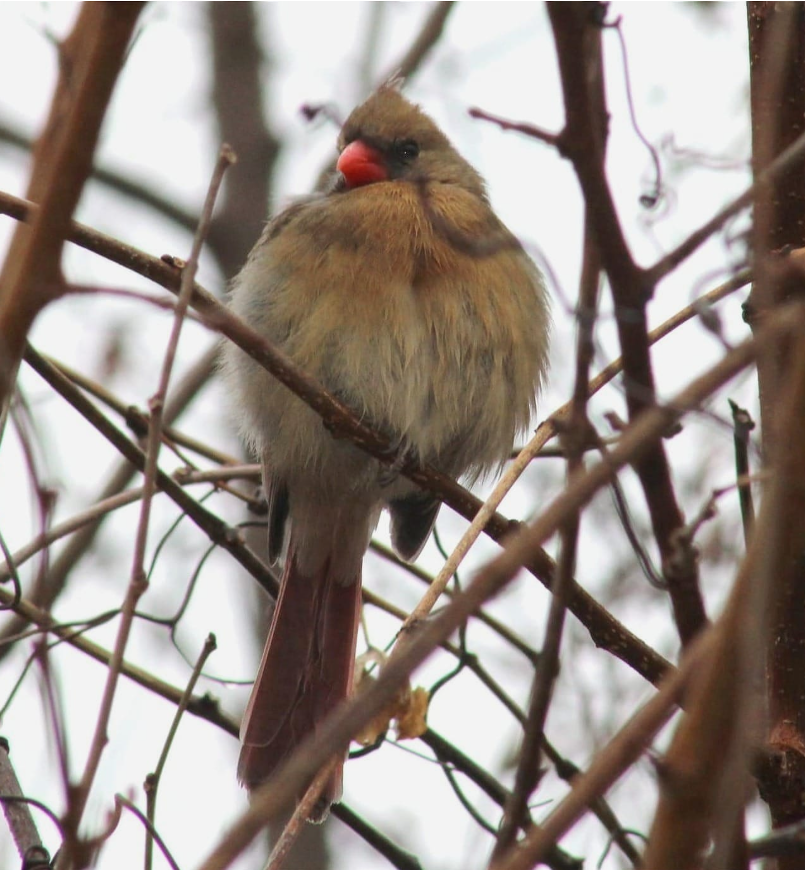 BOTD: northern cardinal, female. She was by herself, but there was male singing for her somewhere. I saw maybe five birds in 23 minutes. This is the only one in any kind of light.