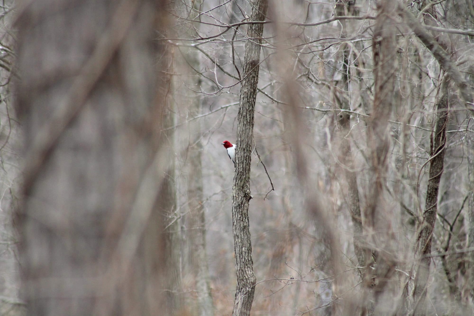 - So the redheaded woodpecker has come down much closer to eye-level than usual, a tiny but beautifully bold splash of red and white against all the brown and gray. This is very nice. Get the woodpeckers off my shit list.
