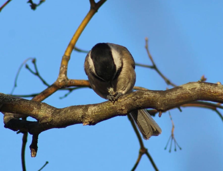 BOTD: Carolina chickadee. I always like it when I catch a bird snacking, and this guy eats cute food, too. They are so small, it always feels like a victory to even see them from the ground, never mind to get a good shot. And just look at that blue sky.